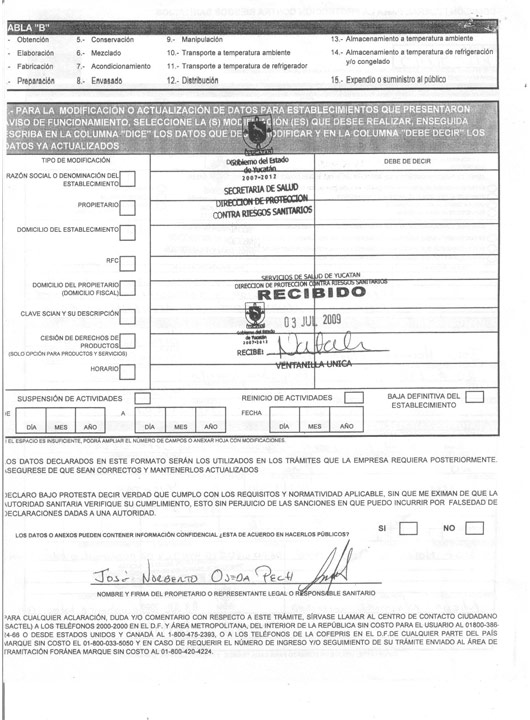 Aviso de funcionamiento de responsable sanitario y de modificación