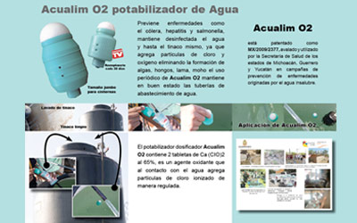 Es un dosificador de hipoclorito de calcio sólido comprimido al 65%, su función principal es desinfectar el agua que se almacena en los tinacos, elimina los parásitos y bacterias, previniendo enfermedades gastrointestinales como el Cólera, Salmonella, Hepatitis, Disentería, Diarreas, infecciones de la piel. En cada descarga de agua y con el movimiento se libera una dosis segura de Acualim-O2 iniciando el proceso de desinfección, las dosis de aplicación son de 0.5 ppm a 1.5 ppm.